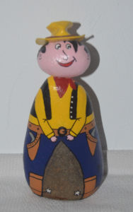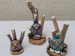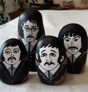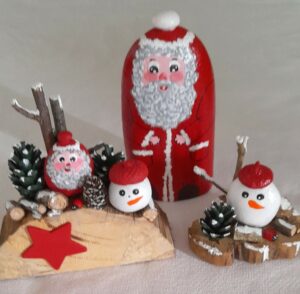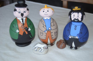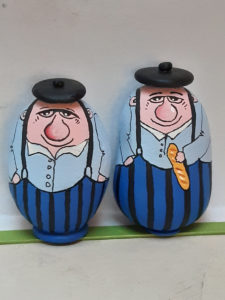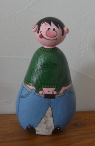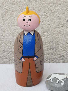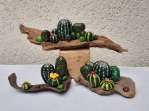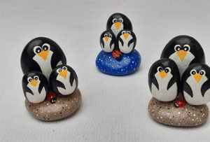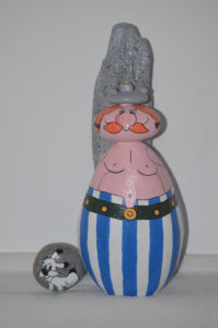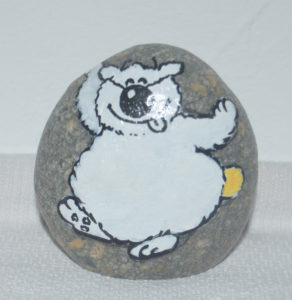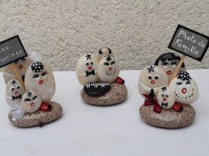 Pour les galets, je m’attache à rester dans un style humoristique et de caricature ; j’espère que vous apprécierez tous ces petits clins d’œil et qu’ils vous feront sourire !